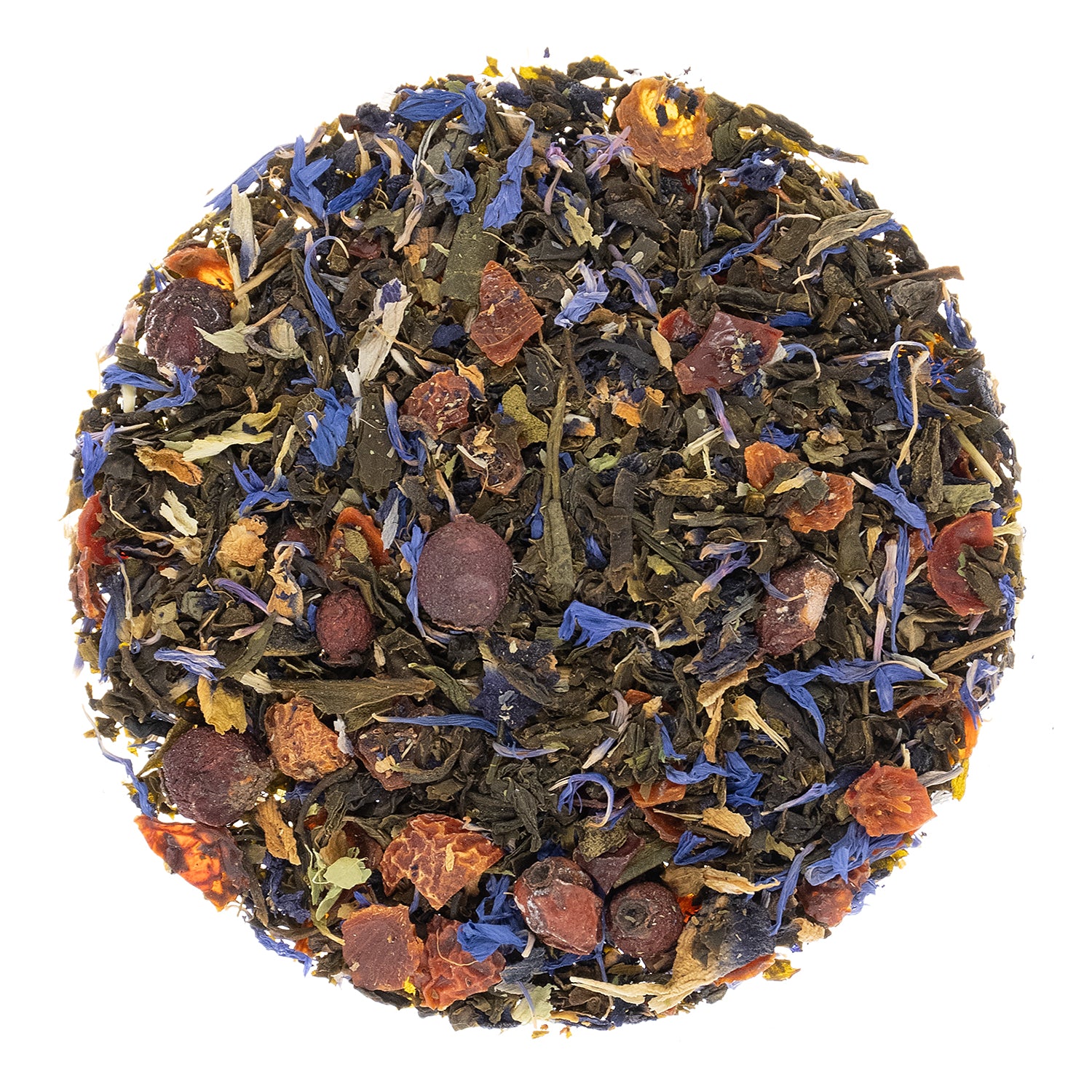 Ingredients: Green tea, Rosehip + Blue Pea flowers petals, Hawthorne fruit, Cornflower petals, Natural flavors (organic compliant).