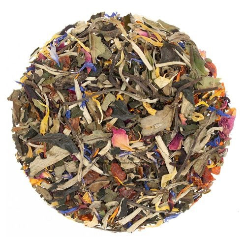 Ingredients: White tea, Rosehip pieces, Hibiscus + Sunflower + Cornflower + Rose + Osmanthus + Safflower + Calendula petals, Natural flavors(organic compliant)